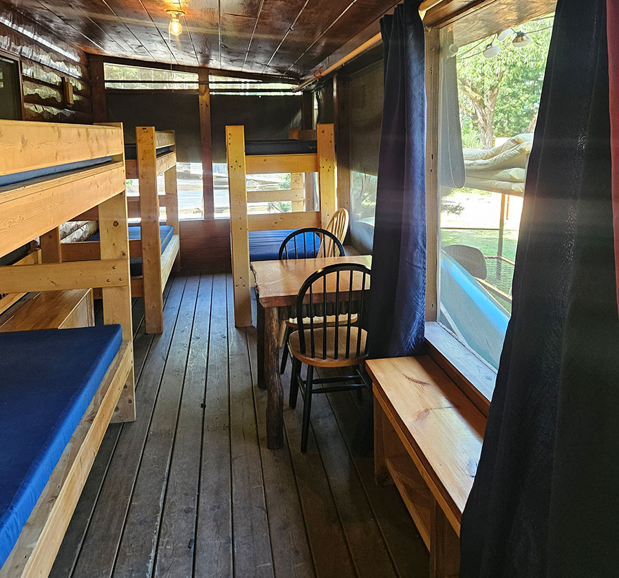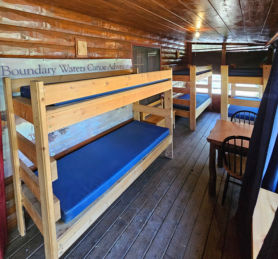 Bunkbeds are 3 (6 sleeping spots) to a room in a 3-season type porch. You have direct access to the Basecamp store and can use the microwave, coffee pot, instant water kettle, or hot plate. Our "summer camp" style bunks are a great way to pull in late and head out before sunrise or once out of the boundary waters to get a good sleep, do some laundry, or enjoy the resort before heading home. Each sleeping spot is $25. Our wood-fired sauna and shower house are nearby. Bring your sleeping bag and pillow, or rent one of ours if you do not want to repack it. Return showers are free with rentals. Limited space is available; please contact us to reserve.